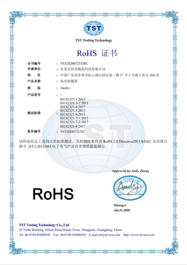 氧化鋁陶瓷是一種較為常見的特種陶瓷材料,鈞杰采用品質優異的進口粉料,燒結出質地優良的氧化鋁陶瓷。我們的材料均已通過ROHS認證。